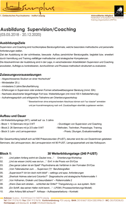 - Nachweis absolvierter längerfristiger Fort bzw. Weiterbildungen (mit mind.100 h Selbsterfahrung)